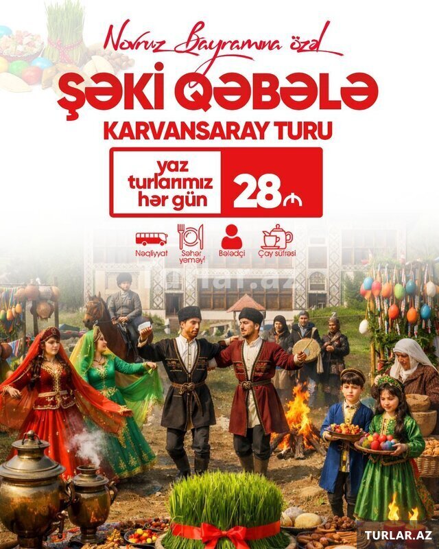 28 Azn ~ Şəki Qəbələ turu •Tarix: 8, 9, 14, 15, 20, 21, 22, 23, 24, 25, 26, 27, 28, 29, 30 Mart •Qiymət: •Ekonom Paket: 28 azn •Standart Paket: 32 azn ✓Qiymətə daxildir: •Nəqliyyat xidməti •Ekskursiyalar •Səhər yeməyi