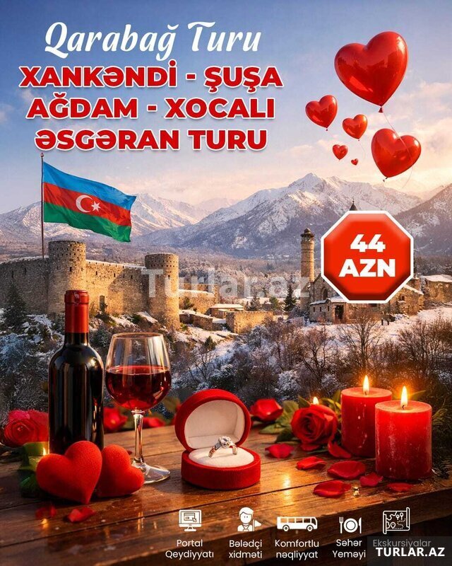 44 Azn Qadınlar gününə özəl Qarabağ turu ~ Xankəndi - Şuşa - Ağdam - Əsgəran - Xocalı turu •Tarixlər: 7-8 Mart (2 gün 1 gecə) 20-21 Mart (2 gün 1 gecə) 21-22 Mart (2 gün 1 gecə) 22-23 Mart (2 gün 1 gecə) •Qiymət: 119 azn