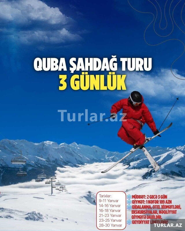 Şirkət179 Azn ~ Tufandağ qış turu •Tarix: 1, 2, 3, 4, 10, 11, 13, 14, 15, 17, 18, 20, 21, 22, 24, 25, 27, 28, 29, 31 Yanvar •Qiymət: - Ekonom paket: 20 azn - Standart paket: 25 azn ✓ Ekskursiyalar: - Tufandağ turizim kompleksi -