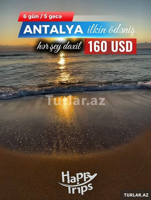 Şirkət859 Azn Antalyaya Hədiyyəli Möhtəşəm Tur Səyahət tarixləri : 01.06.2025 - 07.06.2025 Uçuş Detalları: Azal Bakı 07:55 - Antalya 10:00 Antalya 11:00 - Bakı 14:50 Otellər və qiymətlər: SANTANA HOTEL 3* (Beldibi) – 535 USD BELPOINT