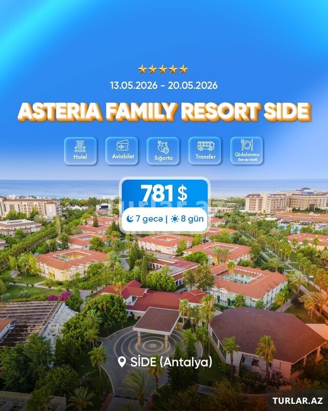 3800 Azn Səyahət tarixləri: 20.06.2026 - 26.06.2026 Uçuş detalları: AZAL Bakı - Antalya: 07:55 - 10:00 Antalya - Bakı: 11:00 - 14:50 Otellər və qiymətlər: MUKARNAS SPA & RESORT 5* (Окурджалар) - 2230 USD GRANADA LUXURY BEACH