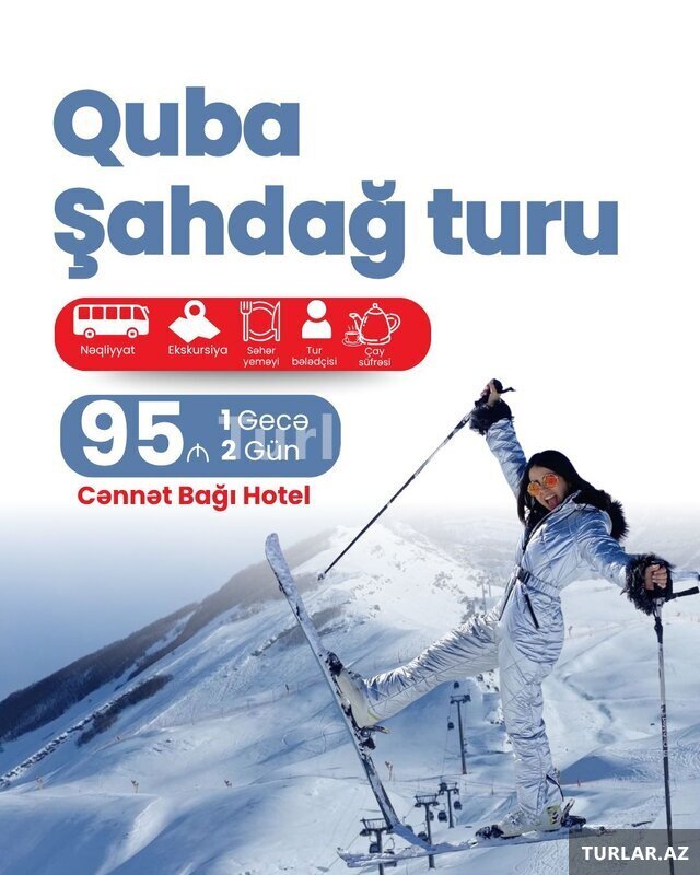Şirkət99 Azn ~ Tufandağ qış turu •Tarix: 1, 2, 3, 4, 10, 11, 13, 14, 15, 17, 18, 20, 21, 22, 24, 25, 27, 28, 29, 31 Yanvar •Qiymət: - Ekonom paket: 20 azn - Standart paket: 25 azn ✓ Ekskursiyalar: - Tufandağ turizim kompleksi -