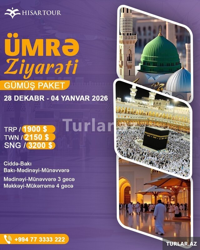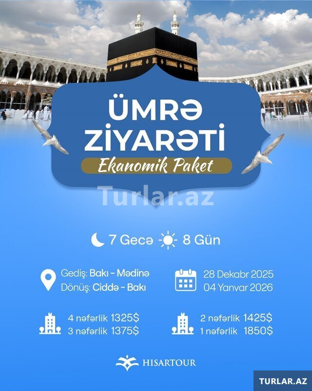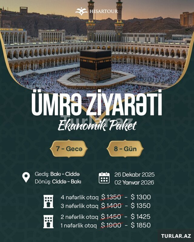 Hisar Tour Ümrə xidmətləri zəvvarlara Məkkəyi-Mükərrəmə və Mədinəyi-Münəvvərəyə rahat, təhlükəsiz və qaydalara uyğun şəkildə ziyarət imkanı təqdim edir. Ümrə proqramlarımızda uçuş biletləri, rahat otel yerləşməsi, gündəlik qidalanma, transfer, ziyarət turları, bələdçi dəstəyi və viza-sığorta xidmətləri bir paket daxilində təqdim olunur.