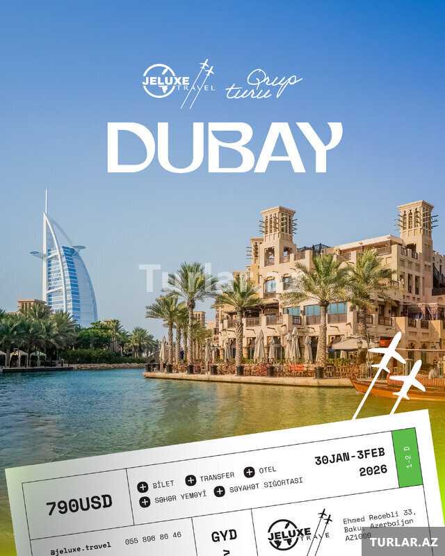 699 Azn LÜKS & MACƏRA DOLU DUBAY QRUP TURU! Hər ay 3 dəfə çıxışla Qızıl şəhərdə unudulmaz anlar! VIP xidmət, əyləncə və rahatlıq – hamısı bir turda! Metrosuz, piyada gəzintisiz – tam VIP nəqliyyat xidməti ilə! ⸻ TARİXLƏR