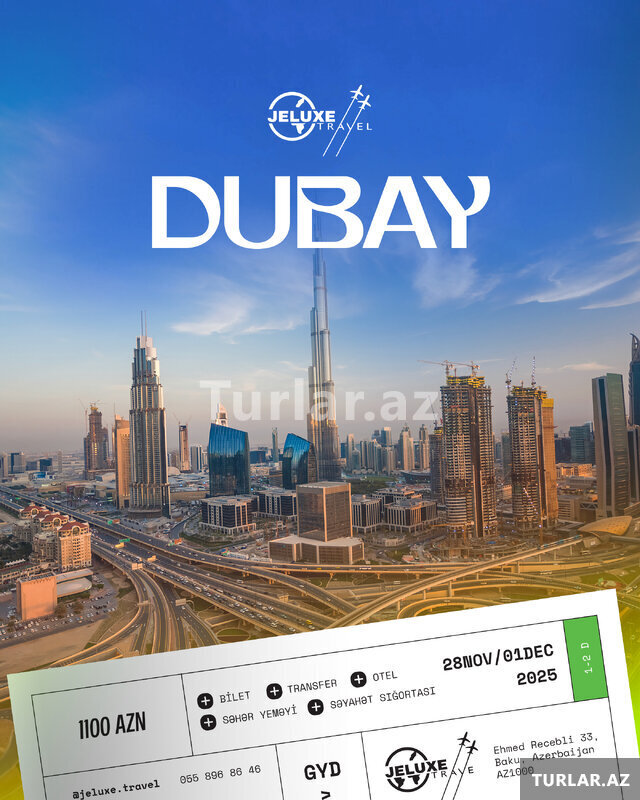 955 Azn LÜKS & MACƏRA DOLU DUBAY QRUP TURU! Hər ay 3 dəfə çıxışla Qızıl şəhərdə unudulmaz anlar! VIP xidmət, əyləncə və rahatlıq – hamısı bir turda! Metrosuz, piyada gəzintisiz – tam VIP nəqliyyat xidməti ilə! ⸻ TARİXLƏR
