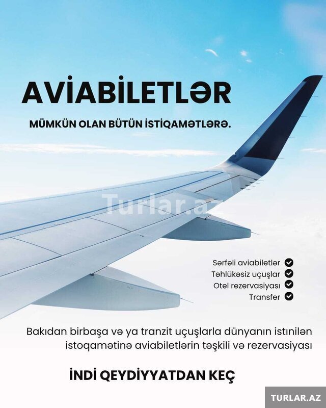 Bakıdan birbaşa çıxışla və ya tranzit uçuşlarla Dünyanın istənilən yerinə Aviabiletlərin satışı həyata keçirilir
