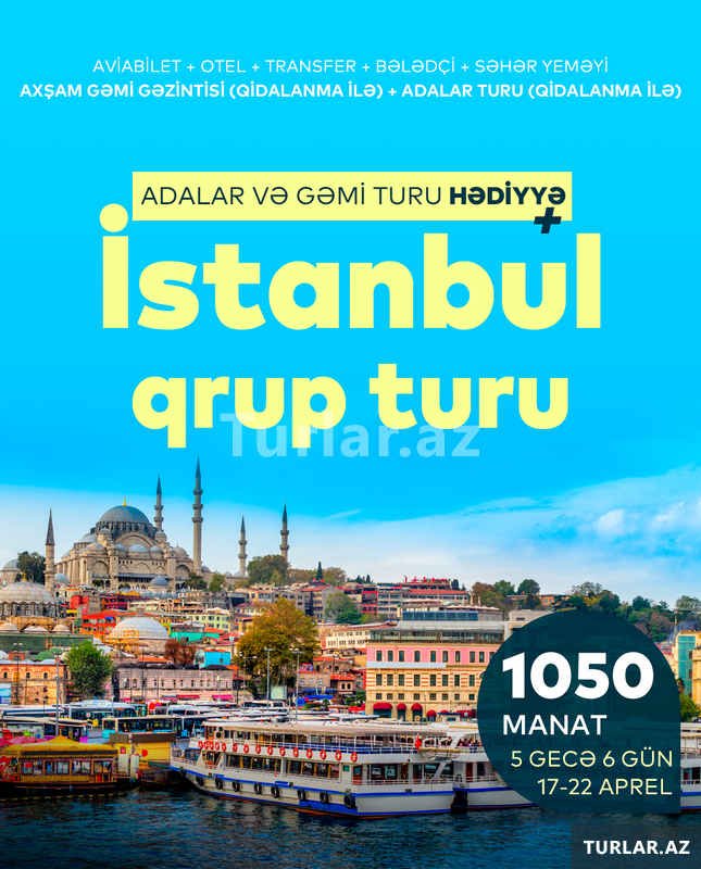 Şirkət605 Azn İstanbul Sizi Çağırır - Qrup Turu ilə Möhtəşəm Səyahət Sevgililər Gününə özəl 13.02.2026 - 17.02.2026 - 599$ Novruz bayramına özəl 20.03.2026 - 24.03.2026 - 699$ 28.03.2026 - 01.04.2026 - 565$ 20.04.2026 - 24.04.2026 -