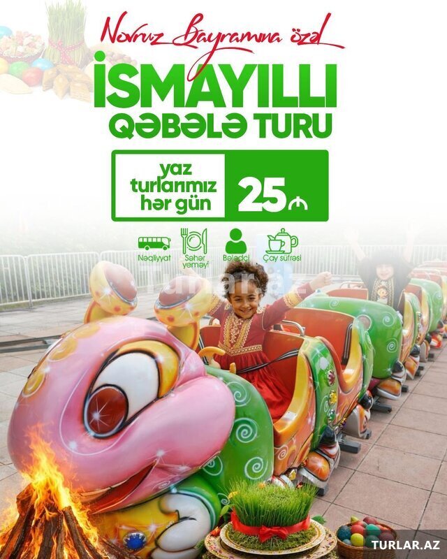 25 Azn Novruz və Ramazan bayramına özəl, adrenalin dolu İsmayıllı Qəbələ turu Tarix: 20, 21, 22, 23, 24, 25, 26, 27, 28, 29, 30 mart Qiymət: Ekonom paket: 25 Azn Standart paket: 29 Azn Qiymətə daxildir: Nəqliyyat