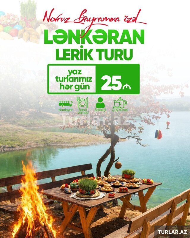 99 Azn Lənkəran Lerik Turu Tarix: 8, 9, 14, 15, 20, 21, 22, 23, 24, 25, 26, 27, 28, 29, 30 Mart Qiymət: •Ekonom Paket: 25 azn •Standart Paket: 29 azn Qiymətə daxildir: •Nəqliyyat xidməti •Ekskursiyalar •Səhər yeməyi (standart