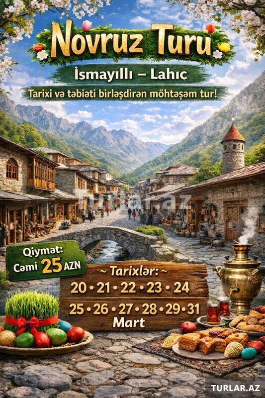 Şirkət25 Azn ~ İsmayıllı Qəbələ turu •Tarix: 8, 9, 15, 20, 21, 22, 23, 24, 25, 26, 27, 28, 29, 30 Mart •Qiymət: •Ekonom paket: 25 azn •Standart paket: 29 azn ✓Qiymətə daxildir: •Nəqliyyat xidməti •Ekskursiyalar •Səhər yeməyi