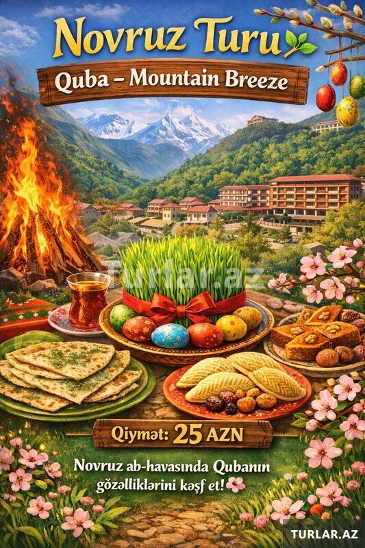 NOVRUZ BAYRAMI MACƏRA QUBA - MOUNTAIN BREEZE TURU •Turun tarixi: 20-21, 22-23 , 23-24 , 24-25 , 28-29 Mart •Turun qiyməti: 129 azn •Müddət: 2 gün / 1 gecə •Giriş: 14:00-15:00 •Çıxış: 11:00 (növbəti gün) ✓Gəzintilər: •