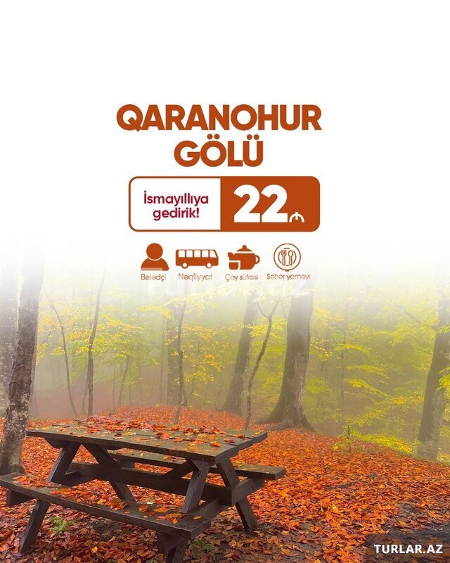 Payızın möhtəşəm turuna hazırsınız? QARANOHUR Gölü TURU Tarix: Şənbə Bazar Günləri Qiymət : Ekanom paket :26azn Standart paket :30azn - Qiymətə Daxildir: Nəqliyyat (Vip) Səhər yeməyi Axşam çayı Bələdçi