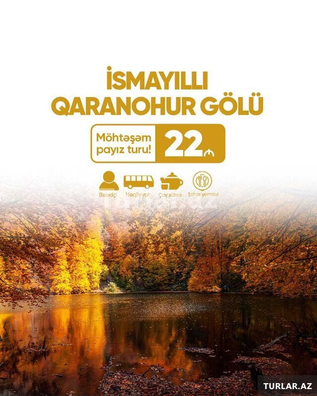 22 Azn Payızın möhtəşəm turuna hazırsınız? QARANOHUR Gölü TURU Tarix: Şənbə Bazar Günləri Qiymət : Ekanom paket :26azn Standart paket :30azn - Qiymətə Daxildir: Nəqliyyat (Vip) Səhər yeməyi Axşam çayı Bələdçi