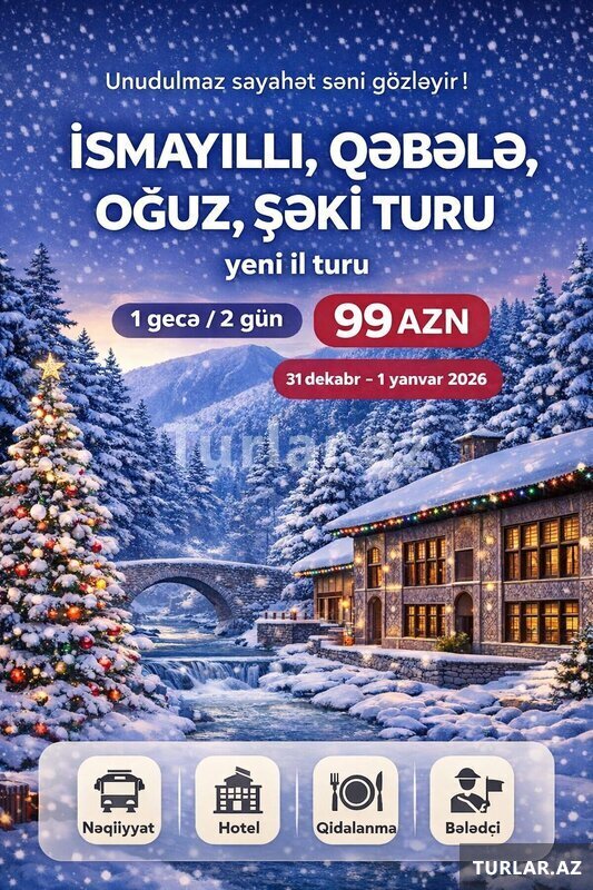 Şirkət139 Azn Yeni İlə Möhtəşəm Bir Başlanğıc! İsmayıllı Oğuz Qəbələ Yeni İl Turu Yeni ili unudulmaz bir səyahətlə qarşılamağa nə deyirsiniz? 31.12.2024 – 01.01.2025 1 Gecə, 2 Gün — 119 ₼ 31.12.2024 – 02.01.2025 2 Gecə, 3