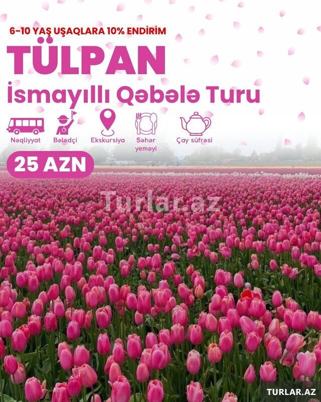 Şirkət25 Azn ~ İsmayıllı Qəbələ turu •Tarix: 8, 9, 15, 20, 21, 22, 23, 24, 25, 26, 27, 28, 29, 30 Mart •Qiymət: •Ekonom paket: 25 azn •Standart paket: 29 azn ✓Qiymətə daxildir: •Nəqliyyat xidməti •Ekskursiyalar •Səhər yeməyi