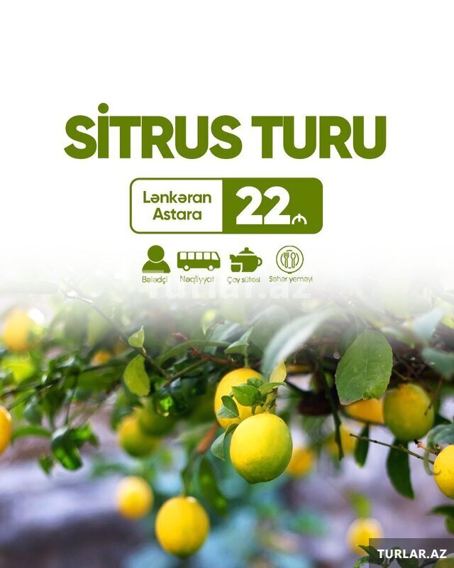 89 Azn  Lənkəran Astara Sitrus turu — •Tarix: 4, 5, 11, 12, 18, 19, 25, 26 oktyabr — •Qiymət: Ekonom paket: 25 AZN Standart paket: 29 AZN — •Qiymətə daxildir: Komfortlu nəqliyyat. Tur rəhbəri. Səhər yeməyi. (Standart paketə
