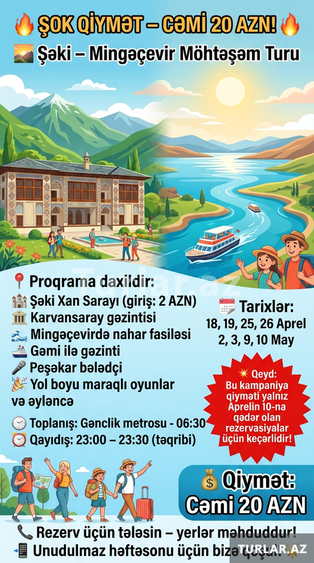 28 Azn ~ Şəki Qəbələ turu •Tarix: 8, 9, 14, 15, 20, 21, 22, 23, 24, 25, 26, 27, 28, 29, 30 Mart •Qiymət: •Ekonom Paket: 28 azn •Standart Paket: 32 azn ✓Qiymətə daxildir: •Nəqliyyat xidməti •Ekskursiyalar •Səhər yeməyi