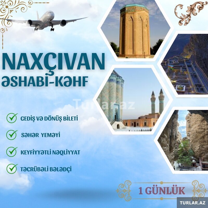 NAXÇIVAN ƏSHABİ-KƏHF TURU Vacib qeyd: Naxçıvana Təyyarə biletləri tez bitdiyi üçün qeydiyyat 2-3-4 həftə öncədən aparılır. Naxçıvan Turu: 1 Günlük Səyahət Bir günlük möhtəşəm Naxçıvan turuna qoşulun və bu qədim diyarın