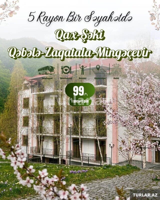 99 Azn *Novruz bayramına özəl *Zaqatala - Qəbələ - Qax - Şəki turu •Turun tarixi: - 20-21 Mart (119₼/149₼) - 21-22 Mart (119₼/149₼) - 22-23 Mart (119₼/149₼) - 23-24 Mart (109₼/149₼) - 28-29 Mart (109₼/149₼) ✓Paketə daxildir: •