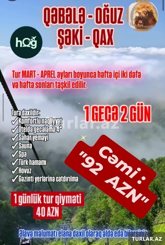 28 Azn Şəki Palace 5* hoteldə Qax Şəki Oğuz Qəbələ Novruz turu •Turun tarixi: 20-21 , 22-23 , 24-25 Mart •Turun qiyməti: 139 azn ✓Qiymətə daxildir: *Səmimi tur rəhbəri *Keçəl kosa tonqal abu havası *Yol boyu əyləncəli