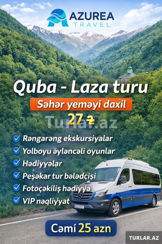 19 AznQusar Laza Quba Turu - Yaz turlarına start verdik. Tarix: 20, 21, 22, 23, 24, 25, 26, 27, 28 29, 30, 31 Mart Qiymət: Eko Paket 25 Azn Standart Paket 29 Azn - Proqrama daxildir: Komfortlu Nəqliyyat