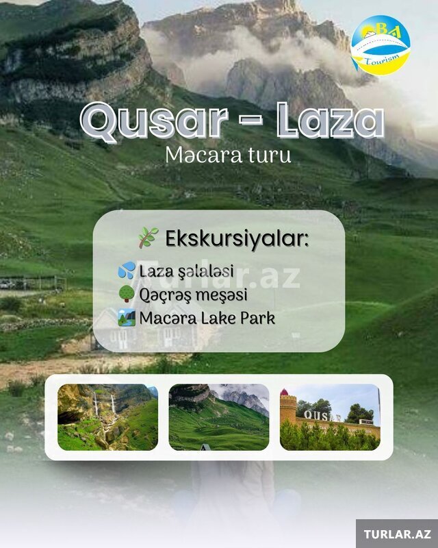 Şirkət129 Azn ~ Qusar Laza Macəra turu •Tarix: 8, 9, 15, 20, 21, 22, 23, 24, 25, 26, 27, 28, 29, 30 Mart •Qiymət: •Ekonom paket: 25 azn •Standart paket: 29 azn ✓Qiymətə daxildir: •Nəqliyyat xidməti •Ekskursiyalar •Səhər yeməyi