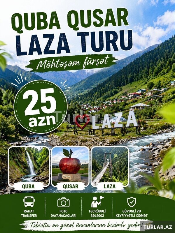 Şirkət25 Azn Sizləri Möhtəşəm əyləncə dolu turumuza dəvət edirik . Bu turda siz əsrarəngiz təbiət, yolboyu maraqlı oyunlar, adrenalin dolu gün yaşayacaqsız, Səhər yeməyi daxil 27 az - Səhər yeməyi xaric 23 azn