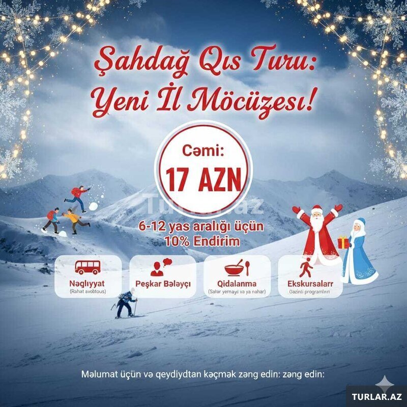 Şirkət119 Azn ŞAHDAĞ TURU Möhtəşəm açılış Qiymət Eko Paket 20 Azn Standart Paket 25 Azn Full Paket 35Azn Tarix: 13, 14Dekabr( Sezon açılışı) 20, 21, 27, 28, 29, 30 Dekabr Yanvar hər həftəsonu Proqrama daxildir Komfortlu Nəqliyyat Tur