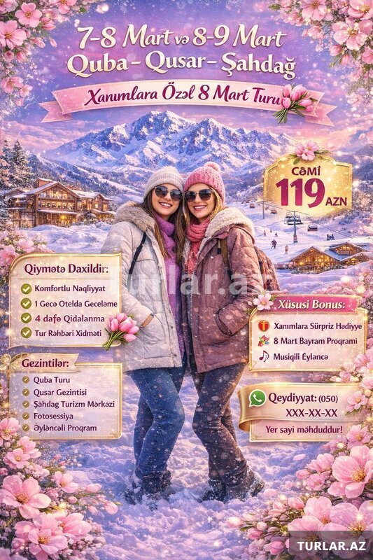 ŞAHDAĞ QIŞ ƏYLƏNCƏ TURU (QUBA - QUSAR) ━━━━━━━━━━━━━━ Tarixlər Yanvar ayı: 16, 17, 18, 21, 23, 24, 25, 28, 29, 30, 31 Fevral ayı: 1, 4, 6, 7, 8, 11, 13, 14, 15, 18, 19, 20, 21, 22, 25, 26, 27,