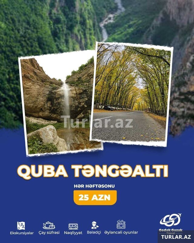 Şirkət50 Azn Əsl həzzi bizimlə birgə Cənub turunda yaşa Lənkəran - Lerik Turu Tarix: Hər həftə sonu Qiymət: Ekanom paket 25 azn Standart paket 27 azn Qiymətə daxildir: Nəqliyyat xidməti (Vip) Ekskursiyalar Qidalanma (Səhər yeməyi