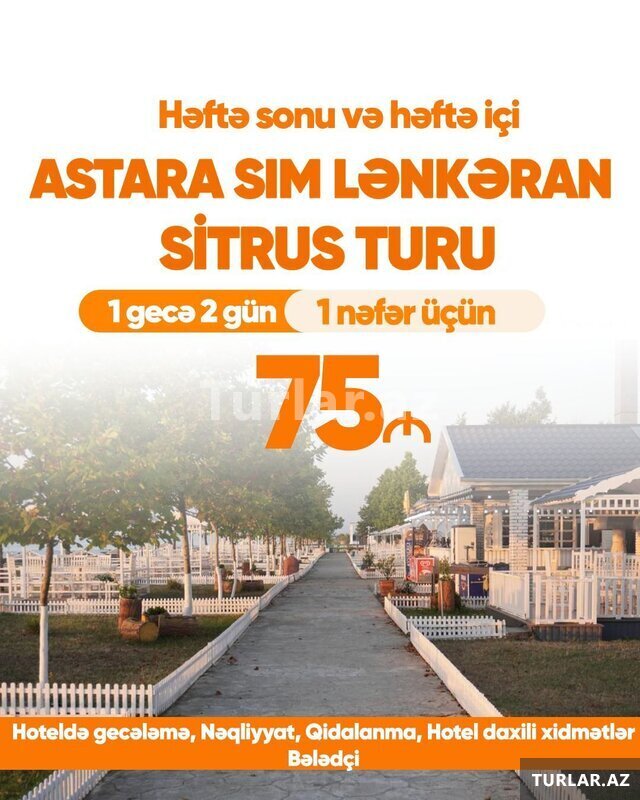 1 Gecə 2 Günlük Möhtəşəm Astara - Lənkəran Sitrus turu . Qiymət: . 75 azn 2 dəfə səhər yeməkli (həftə içi) . - 89 azn 2 dəfə səhər yeməkli (həftə sonu) . - 119 azn (4 dəfə qidalanma). — . Tarix: 25-26 [читат далше]