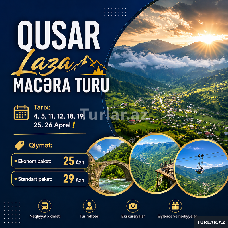 Qusar Laza Macəra Turu. Tarix: 4, 5, 11, 12, 18, 19, 25, 26 Aprel. Qiymət:. Ekonom paket: 25 Azn. Standart paket: 29 Azn. Qiymətə daxildir:. Nəqliyyat xidməti. Ekskursiyalar. Səhər yeməyi (standart paketdə) [читат далше]