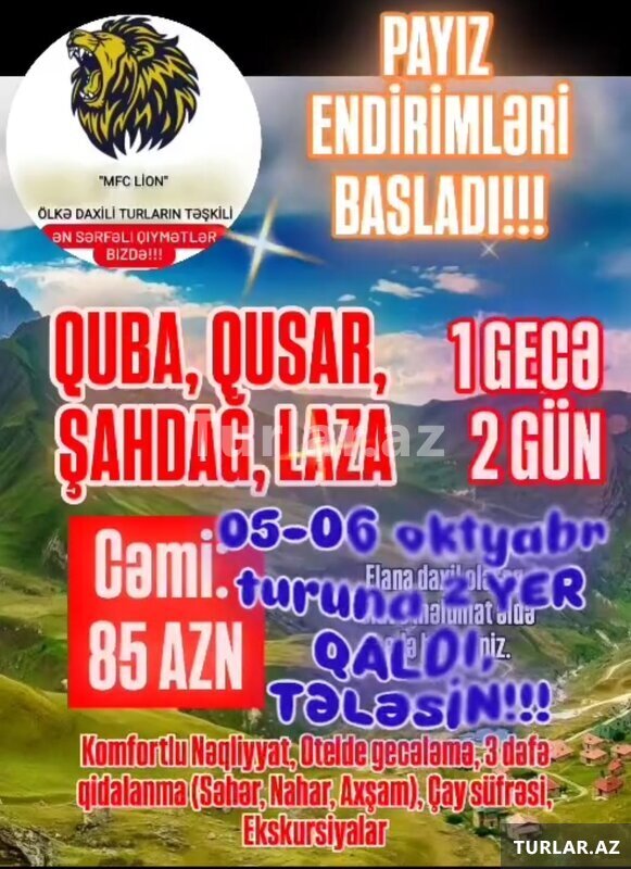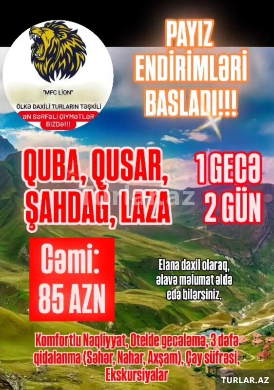Turlar həftədə 3 dəfə, həftə içi Çərşənbə axşamı və Çərşənbə, Cümə axşamı Cümə, həftə sonu isə Şənbə və Bazar günləri 7, 20, və 50 nəfərlik nəqliyyat vasitələri ilə təşkil edilir. Toplanış səhər saat 06:00 [читат далше]