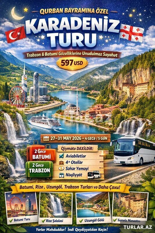 QURBAN BAYRAMINA ÖZƏL. KARADƏNİZ TURU . Trabzon & Batumi Gözəlliklərinə Unudulmaz Səyahət. 597 USD. Bayramı təbiətin qoynunda, möhtəşəm mənzərələr və xoş xatirələrlə keçirmək istəyənlər üçün xüsus [читат далше]