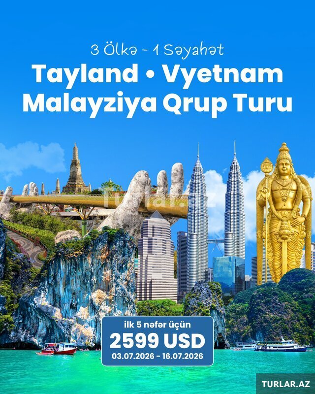 3 Ölkə, 1 Səyahət - Tropik Yay Qrup Turu. Tayland Vyetnam Malayziya. 03.07.2026 - 16.07.2026 (13 gecə / 14 gün). ⸻. Qiymət-2599$ (dollardır). UÇUŞLAR (Air Arabia). 03.07 | Bakı → Phuket. 16.07 | Kual [читат далше]