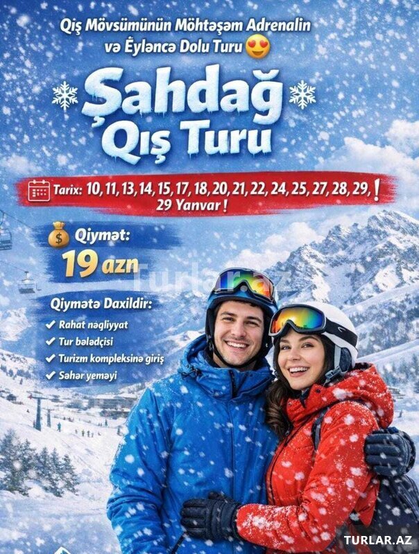 Qış Mövsümünün Möhtəşəm Adrenalin və Əyləncə Dolu Turu Şahdağ Qış Turu Tarix: 13, 14, 20, 21, 27, 28, 29, 30, 31 Dekabr Növbəti ay: 1, 2, 3, 4, 10, 11, 13, 14, 15, 17, 18, 20, 21, 22, 24, 25, 27, 28, 29, 31