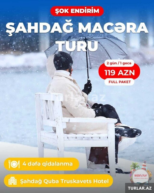 Şirkət189 Azn Adrenalin və əyləncə dolu turu ~ Şahdağ Qış turu ~ •Turun tarixi: 1, 2, 3, 4, 10, 11, 13, 14, 15, 17, 18, 20, 21, 22, 24, 25, 27, 28, 29, 31 Yanvar •Qiymət: ~ Ekonom paket: 20 azn ~ Standart paket: 24 azn ~ Full paket: