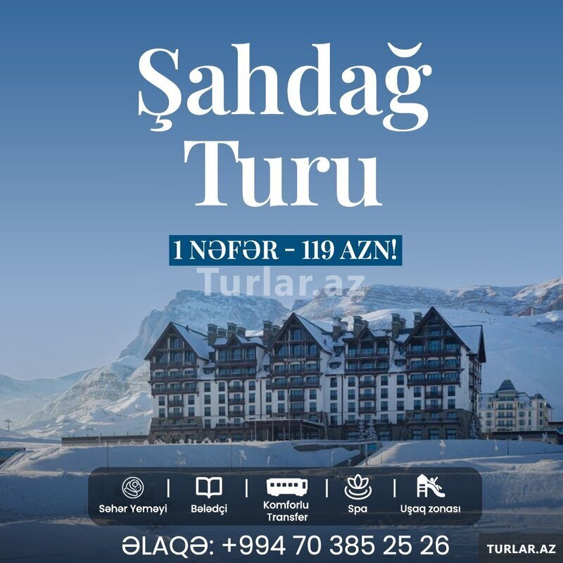 ŞAHDAĞ TURU _ Turun tarixləri: 10, 11, 12, 13, 14, 15, 16, 17, 18, 19, 20, 21, 22, 23, 24, 25, 26, 2728, 29, 30, 31 YANVAR Qiymət: Ekanom paket: 20 AZN Standart paket:25AZN 1 Full paket: 35 AZN 2 VIP paket: 55 AZN (Full