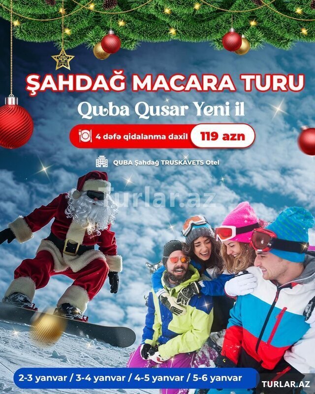 Agentlik39 Azn Şahdağ sezonunu açıq elan edirik Quba Qusar Şahdağ Turu Tarix: Dekabrın ayı : 13 ; 14 ; 20 ; 21 ; 27 ; 28 ; 29; 30; 31 Yanvar ayı : 1; 2; 3; 4; 10; 11; 17; 18; 24; 25; 31; Standart paket 20 azn Ekonom paket 15