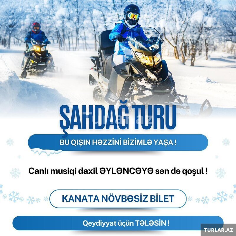 Şirkət189 Azn ŞAHDAĞ TURU Möhtəşəm açılış Qiymət Eko Paket 20 Azn Standart Paket 25 Azn Full Paket 35Azn Tarix: 13, 14Dekabr( Sezon açılışı) 20, 21, 27, 28, 29, 30 Dekabr Yanvar hər həftəsonu Proqrama daxildir Komfortlu Nəqliyyat Tur