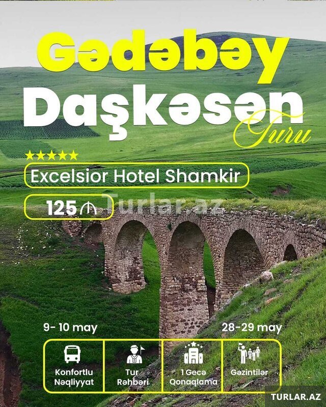 5 EXCELSİOR HOTEL SHAMKİR - gecələmə ilə GƏDƏBƏY DAŞKƏSƏN turu •Tarix: 9-10, 28-29 May •Qiymət: 125 azn ✓Daxildir : - Komfortlu nəqliyyat - 5 Excelsior Hotel Shamkir - gecələmə ✓Otel daxili xidmətlər: Spa