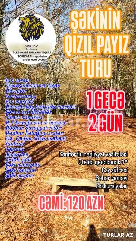Agentlik119 AznŞƏKİ • MARXAL PAYIZ TURU ( ZƏFƏR BAYRAMINA ÖZƏL ) •Turun qiyməti: 8-9 Noyabr ~ Payız mənzərələri fonunda SPA, sauna, hovuz & fitnes ~ Ənənəvi Şəki pitisi və şəhər gəzintisi ~ Qəbələ – Nohurgöl & Qışda