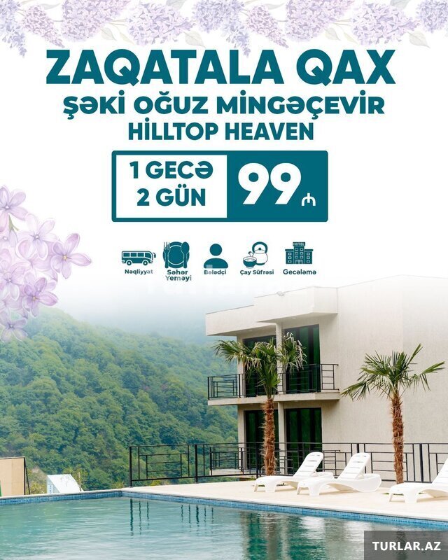 *Novruz bayramına özəl ( 2 gecə / 3 günlük ) *Qax - Şəki - Qəbələ - Zaqatala - Mingəçevir turu •Turun tarixi: 21-22-23 , 22-23-24 Mart •Turun qiyməti: 179 azn ✓Qiymətə daxildir: • Hoteldə gecələmə (Hilltop Heaven