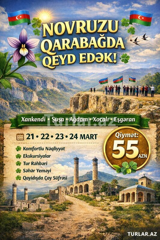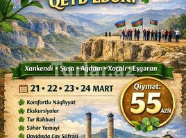 Şirkət44 Azn Novruz Bayramını Qarabağda Qeyd Edək Şuşa - Xankəndi - Ağdərə - Suqovuşan - Ağdam - Xocalı - Əsgəran turu - Tarix: 20-21 və 23-24 Mart - Qiymət: •QARABAĞ Oteldə 4* gecələmək ilə: 159 azn - •BADAM Oteldə 4* gecələmək