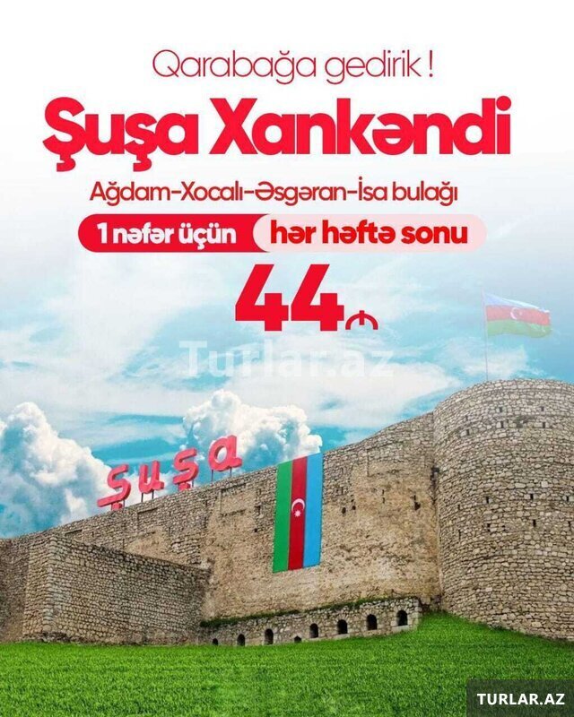 44 Azn ~ Şuşa• Xankəndi • Xocalı • Ağdam • Əsgəran turu •Tarix: 20, 21, 22, 23, 24, 25, 26, 27, 28, 29, 30 Mart •Qiymət: Ekonom paket: 44 azn Standart paket: 49 azn ✓Qiymətə daxildir: •Nəqliyyat xidməti •Portal