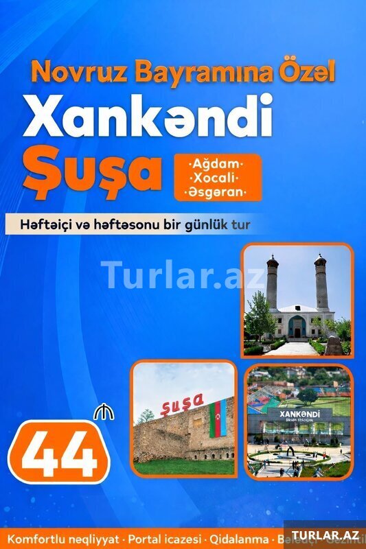 Şuşa• Xankəndi • Xocalı • Ağdam • Əsgəran Turu Tarix: 8, 9, 15, 20, 21, 22, 23, 24, 25, 26, 27, 28, 29, 30 Mart Qiymət: Ekonom paket: 44 AZN Standart paket: 49 AZN Qiymətə daxildir: •Nəqliyyat xidməti •Portal