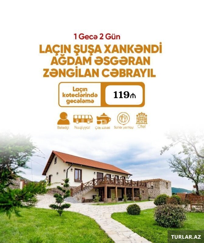129 Azn QARABAĞ TURU Laçın ︎ Şuşa ︎ Xankəndi ︎ Ağdam ︎ Əsgəran * Tarix: 5-6, 12-13, 19-20, 26-27 iyul Qiymət: 139 azn(1 dəfə səhər yeməyi ilə) 149 azn(2 dəfə səhər yeməyi ilə) Qiymətə daxildir: Portal qeydiyyatı Nəqliyyat