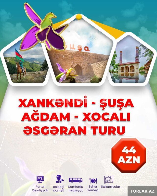 Şirkət105 Azn Xankəndi - Şuşa - Ağdam - Xocalı - Əsgəran turu Tarix : Hər şənbə və bazar Qiymət: Ekonom paket: 44 azn. Standart paket: 49 azn. Qiymətə daxildir: Portal qeydiyyatı Nəqliyyat xidməti Ekskursiyalar Tur rəhbəri Səhər