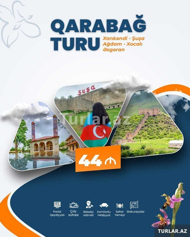 Şirkət44 Azn Xarıbülbülün Sədaları Altında Qarabağ Turu: Xankəndi, Şuşa, Ağdam, Xocalı və Əsgəran üzrə Tarixi Gəzinti_ Tarix : 2, 3, 9, 10, 11, 14, 15, 16, 17, 23, 24, 30, 31 May Qiymət: Ekonom paket: 44 azn. Standart paket: 49 azn