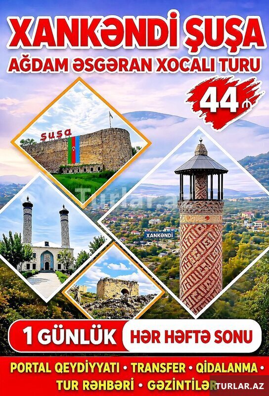 Şirkət129 Azn _Xarıbülbülün Sədaları Altında Qarabağ Turu: Xankəndi, Şuşa, Ağdam, Xocalı və Əsgəran üzrə Tarixi Gəzinti_ Tarix : 2, 3, 9, 10, 11, 14, 15, 16, 17, 23, 24, 30, 31 May Qiymət: Ekonom paket: 44 azn. Standart paket: 49 azn